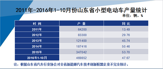 小型電動汽車產(chǎn)業(yè)在市場需求的拉動和政策有力支持下,產(chǎn)銷呈現(xiàn)快速發(fā)展的良好態(tài)勢。山東省汽車行業(yè)協(xié)會常務(wù)副會長兼秘書長魏學(xué)勤在此次高峰論壇發(fā)言中表示,山東省小型電動汽車產(chǎn)量已經(jīng)連續(xù)三年平均增長達(dá)到50%,2016年1-10月山東省小型電動汽車產(chǎn)量為469852輛。